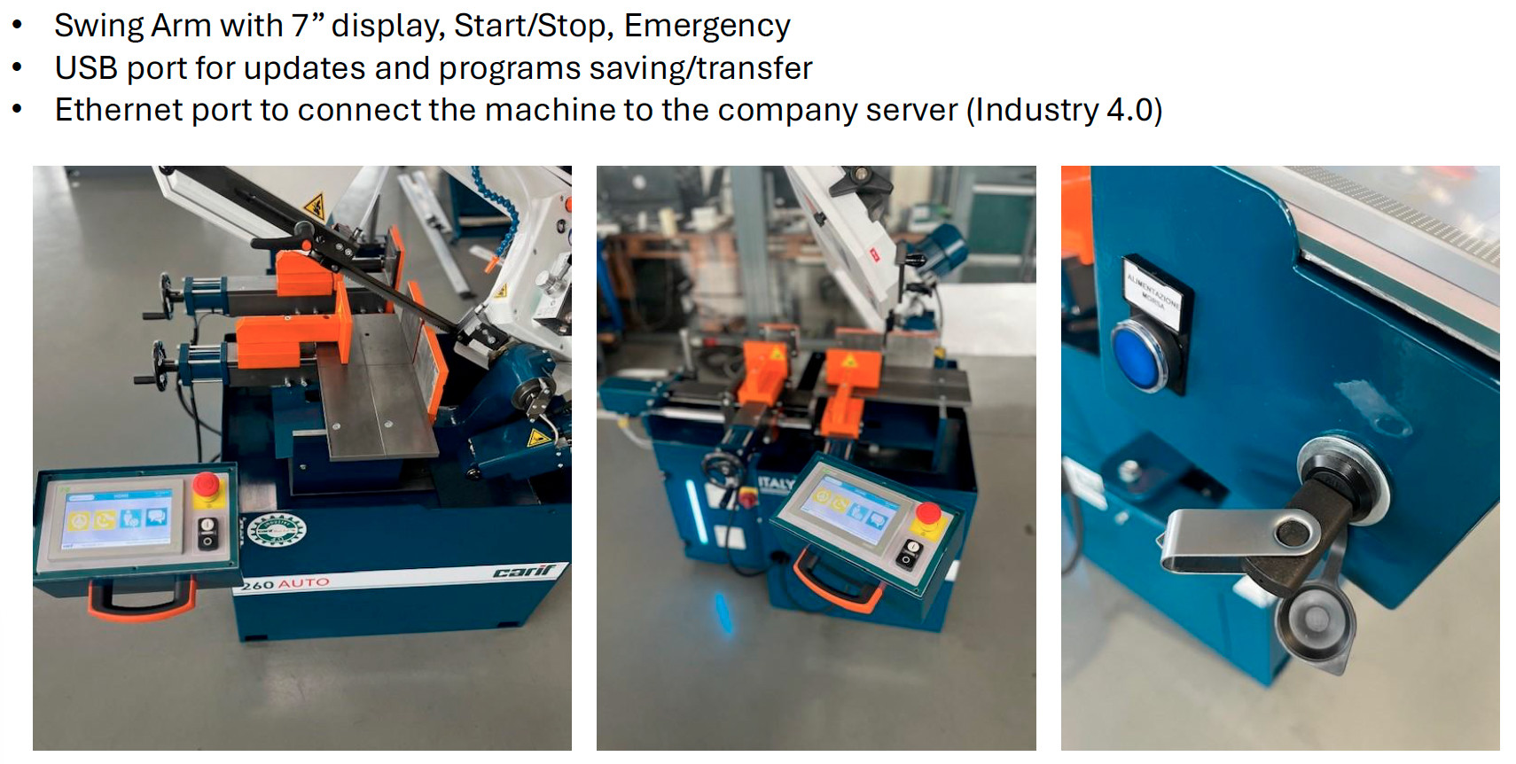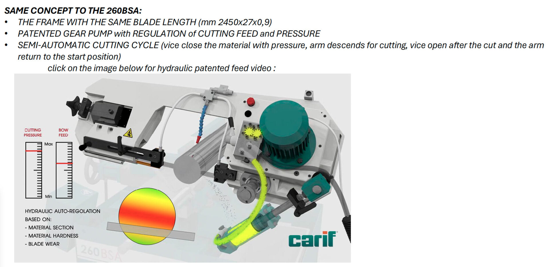 Carif 260 AUTO 4.0 er en nyutviklet, kompakt og allsidig helautomatisk båndsag, basert på den velprøvde 260-serien som har vært produsert i over 20 år. Maskinen kombinerer robust konstruksjon med moderne automatisk mating og Industry 4.0-funksjonalitet.