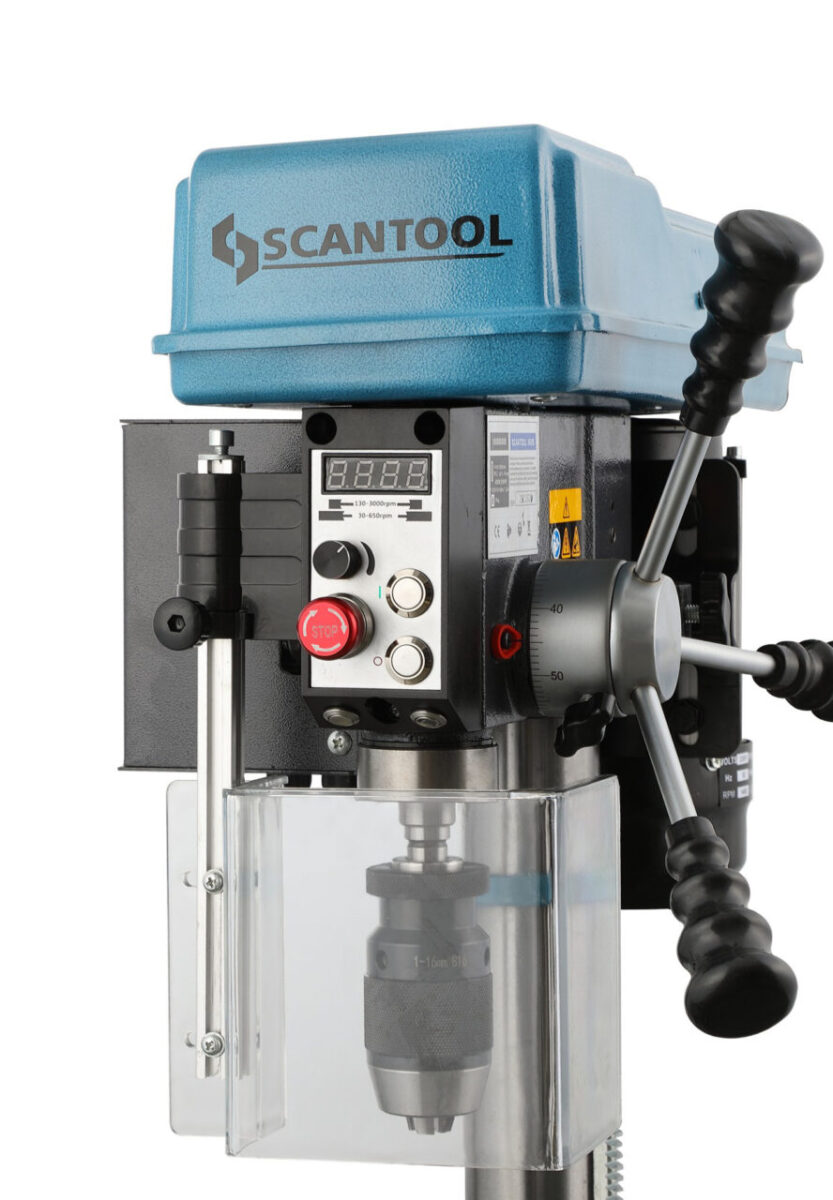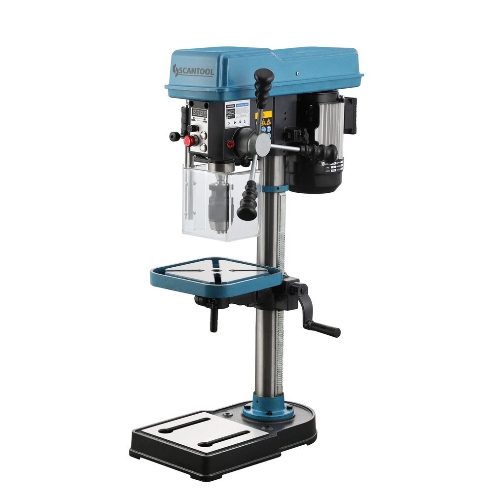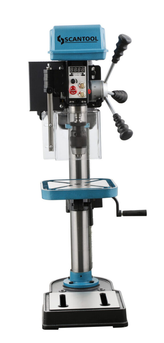 Kompakt søyleboremaskin (benkmodell) med variabel hastighet 30–3000 o/min, MK2 og 16 mm auto-lock chuck. LED-lys og lasermerking gir presis boring, mens nødstopp og verneskjerm med mikrobryter sørger for høy sikkerhet. Vippbart bord (±45°) og 400 W motor – ideell for verksted og vedlikehold.