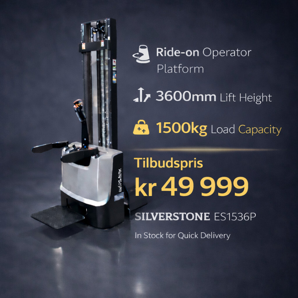 Silverstone ES1536P er en kompakt, helelektrisk stabler med ståplattform, utviklet for sikker og ergonomisk håndtering av paller i lager, butikk, produksjon og logistikkmiljøer.