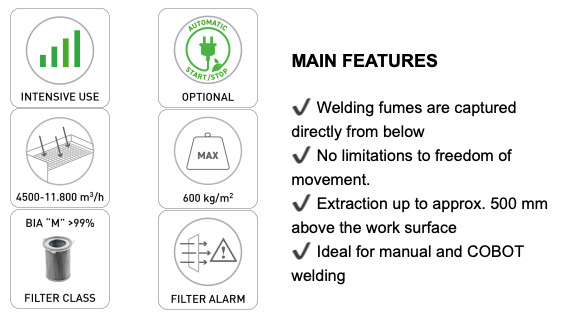 AerBoxSystem er Aerservice Equipments siste innovasjon, en eksklusiv modulløsning for utsuging av sveiserøyk og støv fra sveising, plasmaskjæring, sliping, sliping, kutting, avgrading og polering. AerBoxSystem monteres under sveisebordet ved å erstatte den originale bærestrukturen og samtidig gi samme stabilitet og nyttelast. Takket være sin modulære struktur kan AerBoxSystem installeres under de fleste av markedets sveisebenkeplater.
