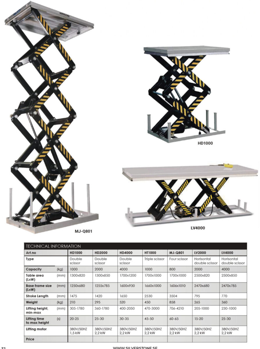 Bord for høye løft og lange varer. Bordet skal festes i gulvet med boltede skjøter. Løftehøyde opptil 4210 mm. Vedlikeholdsfrie svingbøssinger. Stor sikkerhetsavstand mellom saksene for å unngå skader. Løftesylinder med intern drenering. Sikkerhetsventil for å sikre sikkerhet ved slangebrudd. Støysvak kraftpakke med innebygd overbelastningsventil. Sikkerhetsbryter i toppposisjon. Bevegelig grensebryter for justering av fullt hevet stopp. 4 endestopp, inkl. 4 løkker som kan brukes f.eks. ved løfting av hele løftebordet ned i en grop. Støysvak kraftpakke med innebygd overbelastningsventil. Kabel for 3-fasetilkobling 380V/16 Ah. Godkjent i henhold til EN1570-1.
