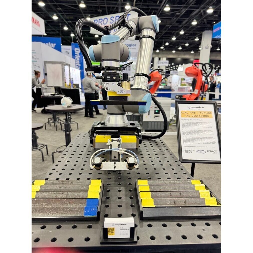 Magswitch-arrayene kan festes flatt eller vinkles slik at de kan monteres på sylindriske ferromagnetiske overflater, og de har en bred kontaktflate for å redusere risikoen for avskalling og vridning når endeeffektoren er på sin største radius. Se måltegningen nedenfor. Den standardiserte monteringsplaten er klar for montering på FANUC CRX-10, UR10 og UR16 COBOTS. Tilpassede monteringsplater og hullmønstre kan integreres; kontakt eirik@prmaskin.no for mer informasjon om tilpasning.
