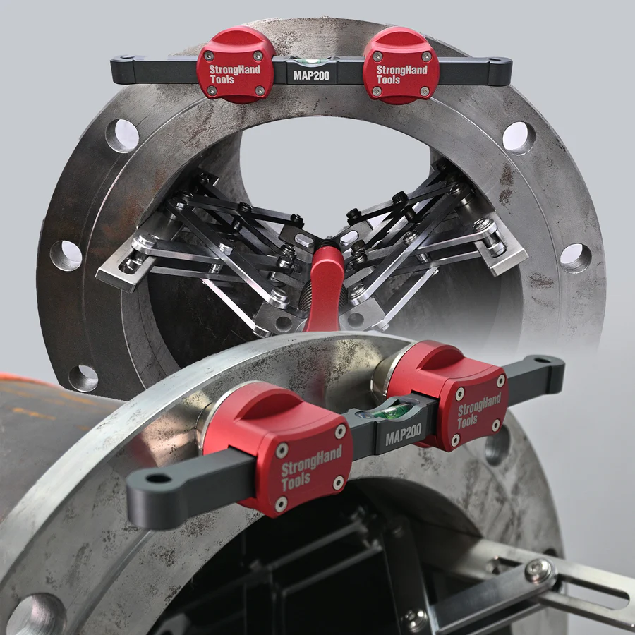 Quickly pop the self aligning pin heads onto some flange holes and level with the built in bubble vial. No need to take off your gloves and fiddle with screws.
