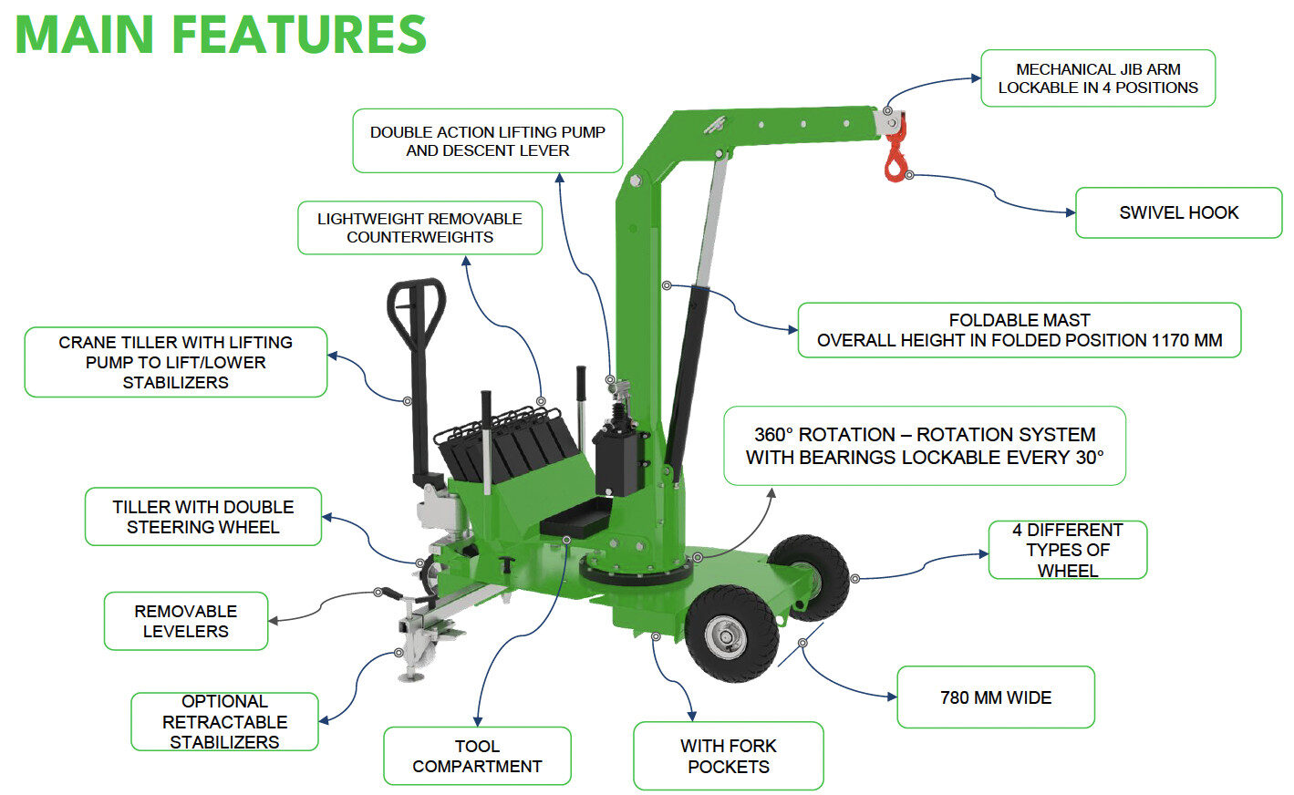 MILOAD MG400 kan konfigureres med fire ulike hjultyper (luft, massiv gummi, nylon eller superelastisk), slik at den kan brukes på alle typer gulv og underlag. Kranen har 360° rotasjon, låsbar for hver 30. grad, og en mekanisk jibarm som kan låses i fire posisjoner – noe som gir høy presisjon og trygg håndtering av last.