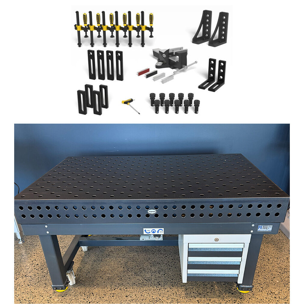 Denne pakken inkluderer løftebord på hjul inkl Siegmund sveisebord 1500x1000mm System 22. NB: Skuffesjon med 3 skuffer som er på bilde er opsjon / tilbehør, se pris under.