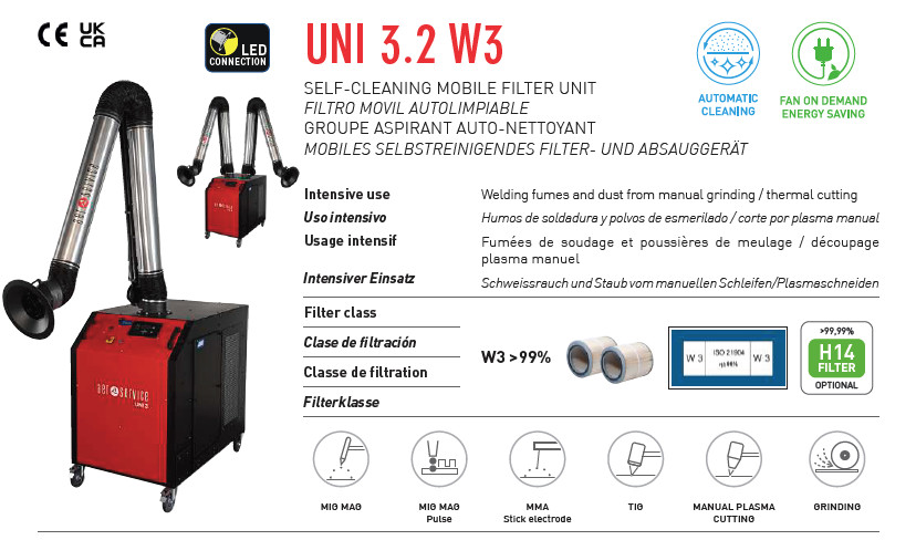 UNI 3.2 W3 er en kraftig mobil filterenhet utviklet for intensiv bruk ved oppsamling og filtrering av sveiserøyk, slipestøv og røyk fra termisk skjæring. Enheten er W3-sertifisert i henhold til UNI EN ISO 21904-1/2 og har en filtreringseffektivitet på over 99 %, noe som sikrer et trygt og rent arbeidsmiljø ved sveising og metallbearbeiding.