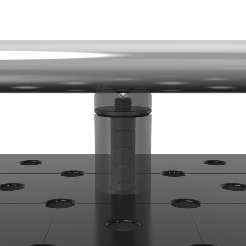 Delesett i 11-deler gir mulighet til å skape variable opplagsflater i høyden. De enkelte opplagsskiver kan brukes for å regulere høydedifferensen mellom 1-100 mm. For at den ønskede høyden kan oppnås mest mulig nøyaktig er den minste størrelsen på opplagsskiven 1 mm. Målet er nøyaktig angitt på alle skivene. Ved hjelp av O-ringen kan opplagene justeres lett og presist. Opplagssettet kan brukes universelt pä alle 22-boringer. M10-gjenget på innersiden av opplaget gjør det mulig å skru på kundespesifiserte byggeelementer eller prismer.