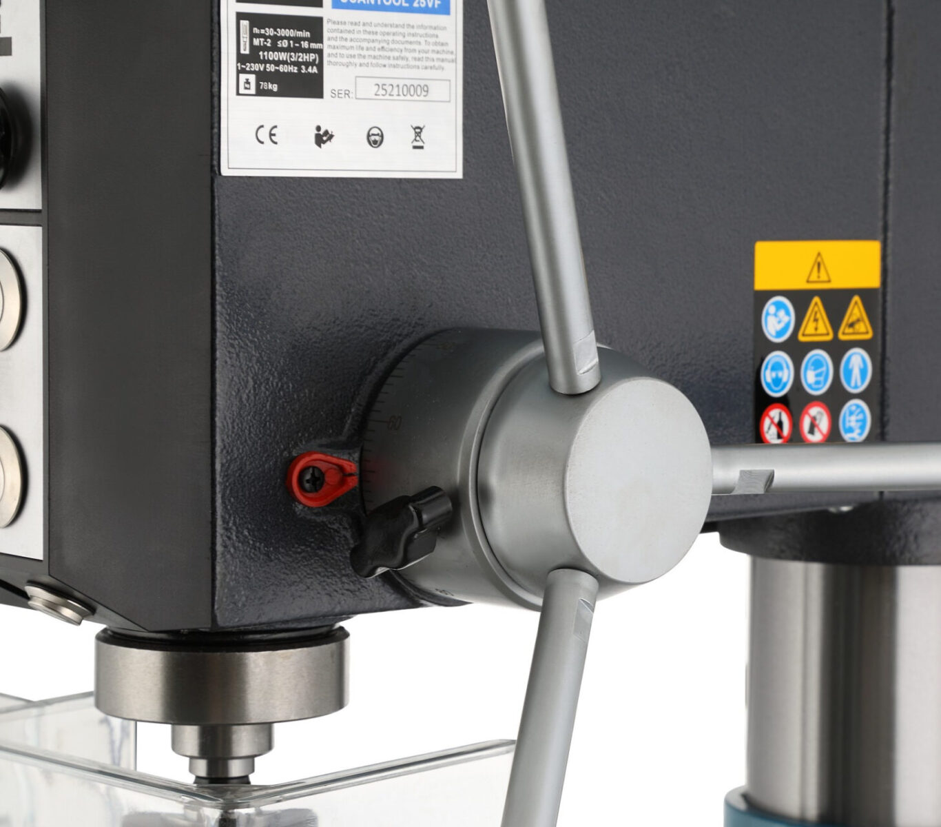 Kraftig søyleboremaskin for verksted og produksjon – 1100 W motor, MK2-spindel og borekapasitet Ø23 mm.