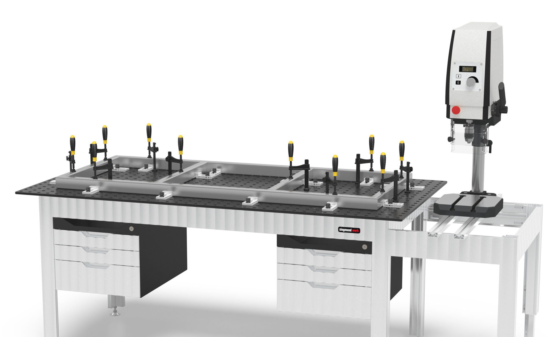 Den robuste bunnrammen laget av aluminiumsprofiler i den ekstraordinære Siegmund-designen er grunnlaget for arbeidsbenken vår. Utstyrt med en velprøvd Siegmund perforert plate, kan du enkelt feste ulike tilbehør som stopp, inventar eller skrustikke til arbeidsbenken for å trygt feste arbeidsstykket.