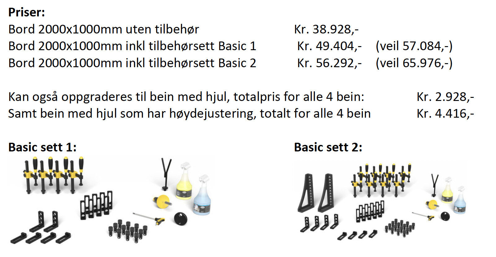 Velg mellom Basic sett 1 eller 2, begge er nedsatt. Tilbehøret til venstre på bilde er Basic sett 1 og bilde til høyre er Basic sett 2. Resterende bilder er eksempel bilder på bruk av system 16 sveisebord.