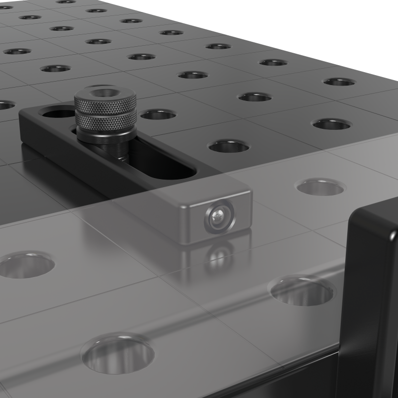 Universal-Anslag 225 L FDS er en videreutvikling av Anslag 225 L, og leveres i tillegg med et integrert fjærtrykkstykke. Dette gjør anslaget spesielt godt egnet for sikker og effektiv oppspenning av plate- og formdeler.